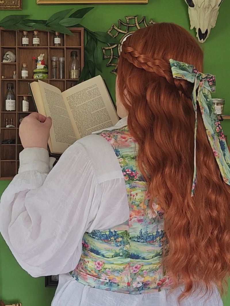 All items are sewn only after purchase has been completed. Every bodice made is custom and unique, crafted to be reversible with the pattern listed as the outside, and a solid color for the inside. After your order has been placed, sewing begins immediately. Custom sewing orders can take up to 4 weeks, so please be patient.